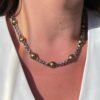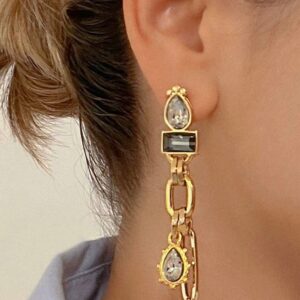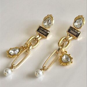 Brinco com elos, cristais e pérola, super leve e confortável de usar, no banho dourado.