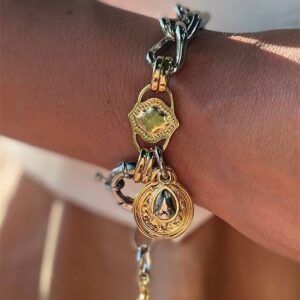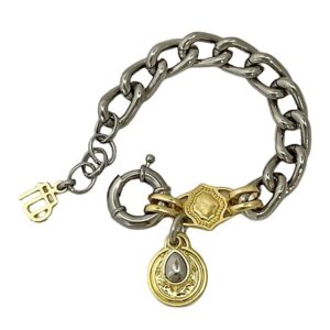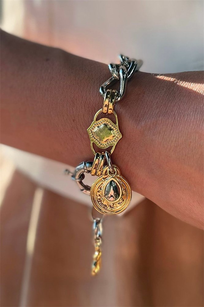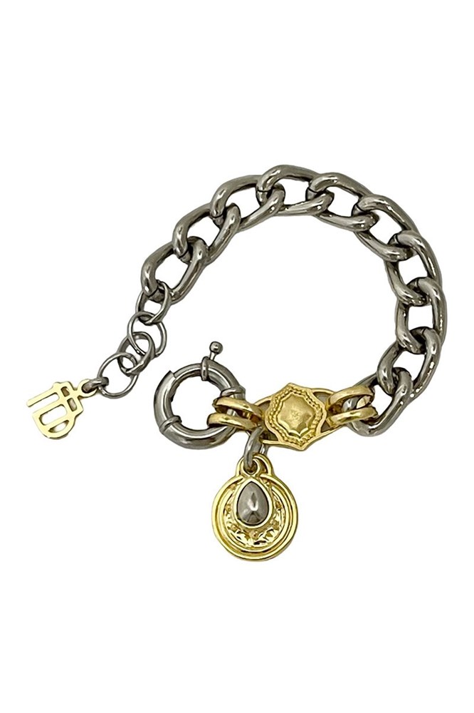 Pulseira formada por corrente grumet no banho prata e pingentes variados no banho dourado.