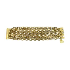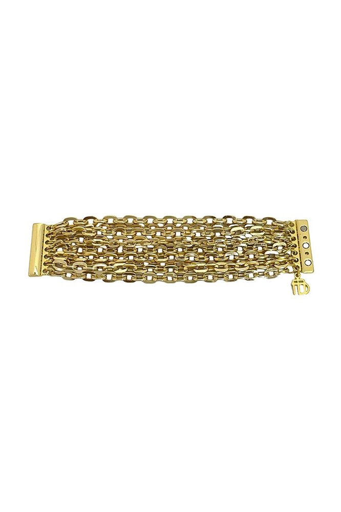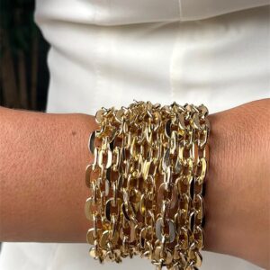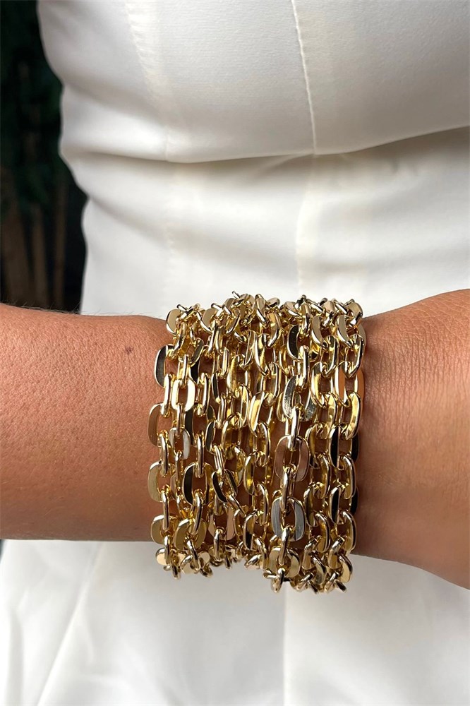 Maxi pulseira formada por correntes malha cartier em duas espessuras, no banho dourado.