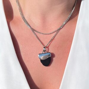 Colar longo formado por corrente grumet fina e pingente de pedra natural obsidiana negra em formato orgânico, no banho prata. Colar longo com possibilidade de uso em duas voltas.